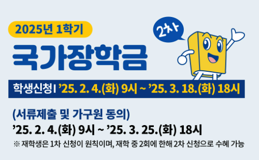이 신청은 신입생, 편입생, 재입학생, 복학생 및 1차 신청을 놓친 재학생을 대상으로 하며, 신청 기간을 놓치면 올해 1학기 국가장학금을 받을 수 없습니다.